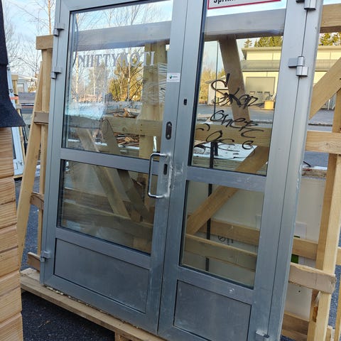 Hakusessa viilureunaiset lasiovet. Saa olla pientä laittoa ja vaikka ilman kahvoja.