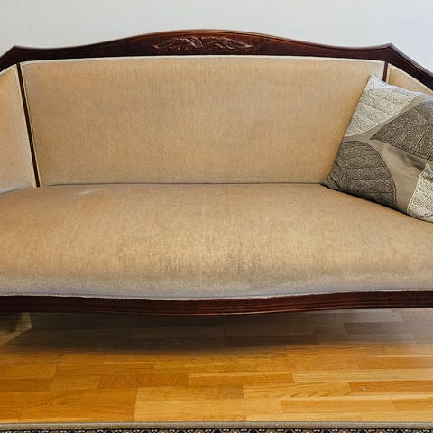 Puuverhoiltu sohva, sohvapöytä ja 4 tuolia, beige kangasverhoilu
