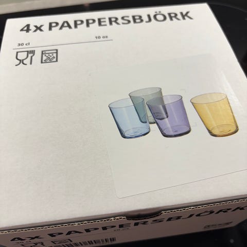 IKEA juomalasit, joissa värikäs päärynä kuviointi.