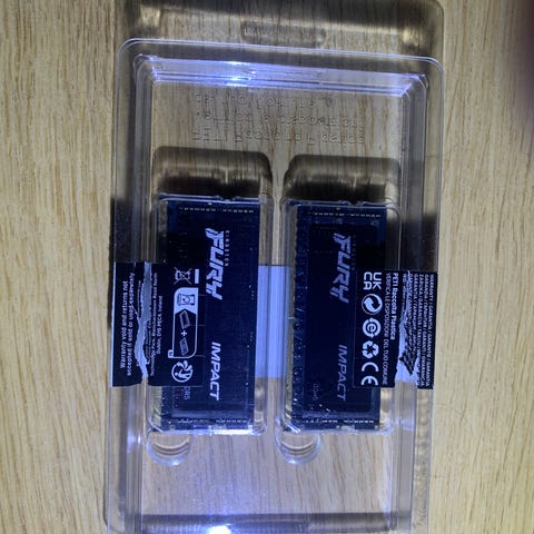 Kingston Fury Impact DDR5 SO-DIMM RAM-muisti, yhteensä 64 Gt (2 x 32 Gt) -paketti. Muistikammat on tarkoitettu kannettaviin tietokoneisiin tai muihin SO-DIMM-liitäntää käyttäviin laitteisiin. Tyyppi: DDR5. Mallimerkintä: KFS48S38IBK2-64. Jännite 1,1 V. Sopii järjestelmiin, jotka tukevat DDR5 SO-DIMM -muistia ja 64 Gt kokonaiskapasiteettia. Kuvissa näkyy lisäksi kaksi erillistä sovitinkorttia, jotka voivat olla tarkoitettu muistin testaukseen tai erikoiskäyttöön; niiden yhteensopivuus ja käyttötarkoitus kannattaa varmistaa erikseen omasta laitteistosta.