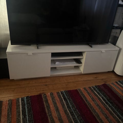Valkoinen TV-taso LED-valoilla.