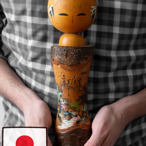 Kaunis vintage japanilainen sosaku-tyylinen kokeshi, jossa käsinmaalattu maisema-aihe. Tummalle pohjalle on kuvattu perinteinen talo, kivisilta ja vesimaisema, jotka luovat rauhallisen ja harmonisen tunnelman. Jalusta on luonnollista puunkuorta, joka tuo rustiikkista ilmettä ja korostaa käsityön tuntua.