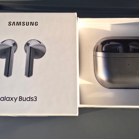 Samsung Galaxy Buds kuulokkeet alkuperäispakkauksessa. Säilytyslaatikko, jossa kuulokkeet myös ladataan.