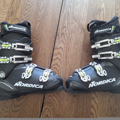 Nordica Cruise laskettelumonot, pohjan pituus 275 mm. Sisäkenkä 225. Vastaa noin kokoa 36. Väri valkoinen harmailla ja sinisillä yksityiskohdilla. Monossa on neljä säädettävää solkea ja leveä hihna varren yläosassa istuvuuden säätöön.