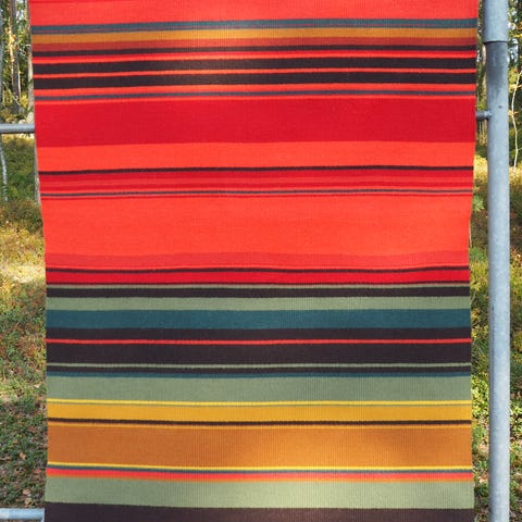 Kapea raanu, jonka pohjaväri on tummansininen. Yläreunassa on tankokuja noin 2½ cm. Materiaali on villaa. Hyväkuntoinen.