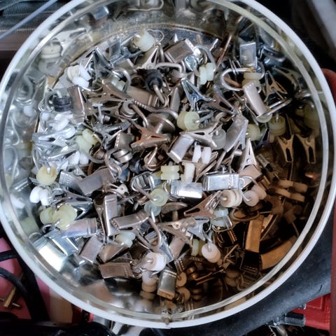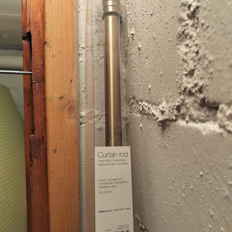 Puinen verhotanko renkailla.