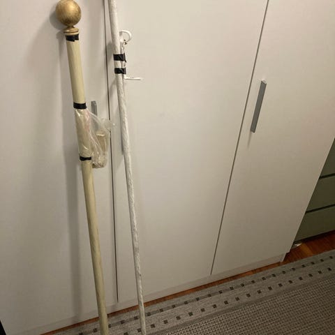 Puinen valkoinen verhotanko renkailla. Pituus nupin päästä mitattuna 175cm. Kannakkeet mukana.