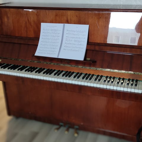 Puutteet: nuottiteline haljennut (saa mukaan), yhdestä valkoisesta nappulasta puuttuu alapuolelta palanen (kysy kuvaa).