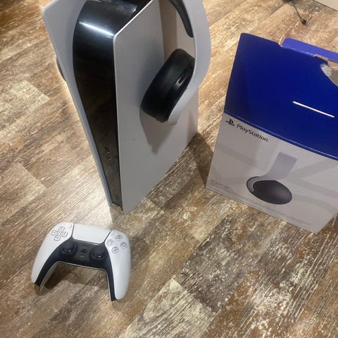 Sony PlayStation 5 -pelikonsoli valkoinen. Kuvissa näkyy konsoli sekä kaksi DualSense-ohjainta (valkoinen ja vaaleanpunainen) sekä GX Trust Carus -pelikuulokkeet mikrofonilla. Konsoli on PlayStation 5 -Levyllinen mallia, jossa valkoinen kuori ja musta keskiosa. Ohjaimet ovat langattomia DualSense-ohjaimia. GX Trust Carus -kuulokkeet ovat kevyet pelikuulokkeet, joissa on säädettävä mikrofoni ja pehmustetut korvakupit. Kokonaisuus soveltuu PlayStation 5 -pelaamiseen kotikäytössä.