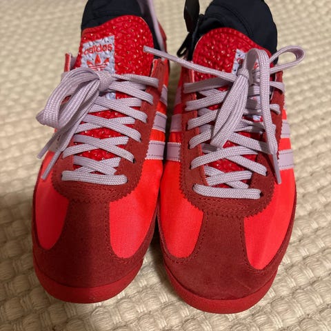 Vain muutaman kerran pidetyt pinkit Adidas lenkkarit. Koko 37 ja 1/3. Omalle jalalle väärä lesti, joten eteenpäin. Muutoin todella siistit, mutta sisäpuolella kantapäähän tarttunut tummasta sukasta nukkaa.