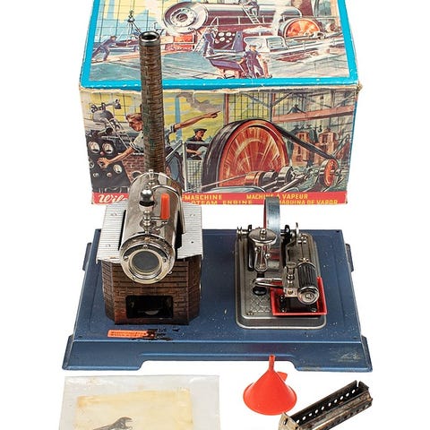 Mamod SP 2 on klassinen, kiinteällä polttimella varustettu pienoishöyrykone. Siinä on messinkinen kattila, punainen teräsalusta ja musta piippu valkoisella tekstillä. Mukana tulee alkuperäinen pakkaus, poltinalusta sekä täyttösuppilo.Pienoishöyrykoneessa on liikkuvat osat, vauhtipyörä ja vesitason näyttö kattilan päädyssä. Kattilassa ja poltinalustassa on nähtävissä käytöstä johtuvaa tummumaa ja hapettumaa.TestaamatonValmistaja: MamodMitat (LxKxS) ovat noin 21 x 16/20 x 13 cmVäri: punainen, musta, messinkiMateriaali: metalli, messinki