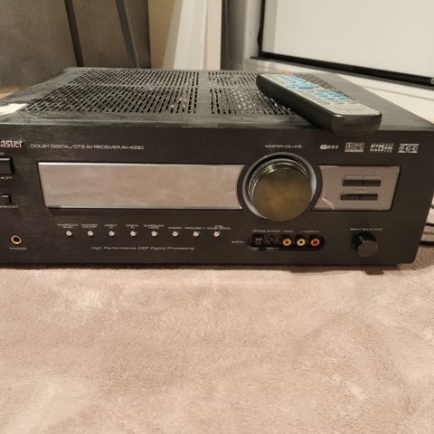 Valmistaja: PioneerMalli: VSX-422-KTeho: 100 wattia kanavaa kohden 8 ?:iin (stereo)Surround-lähtöteho: 100 W (edessä), 100 W (keskellä), 100 W (takana)Taajuusvaste: 5 Hz - 100 kHzSignaali-kohinasuhde: 98 dB (linja)Kaiuttimen kuormitusimpedanssi: 6? - 16?Digitaalitulot: koaksiaalinenVideoliitännät: HDMI, komposiittiViritysalue: AM/FMMitat (LxKxS) ovat noin 43 x 17 x 34 cmPaino noin 8,8 kgKaukosäädin puuttuu.Kierrätyskeskuksen tarkistama tuote.