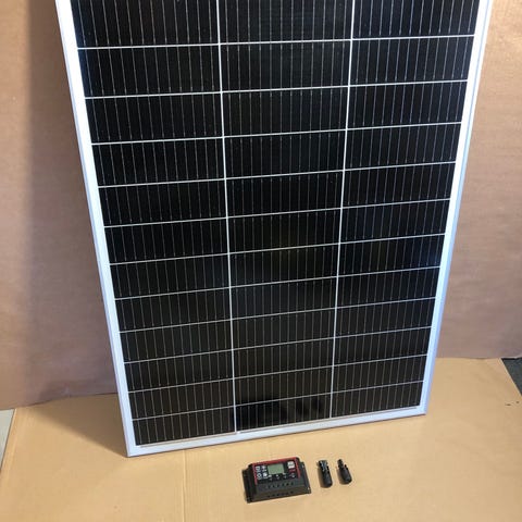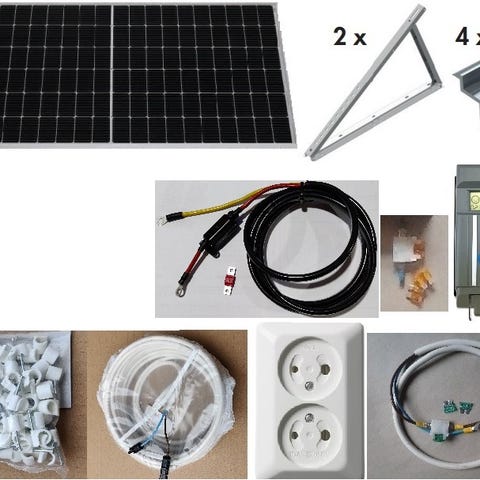 Aloituspaketti rantasaunaan tai mökkiin jossa käytetään ainoastaan LED lamppuja ja ladataan puhelimia. Kaikki on uutta, takuu.