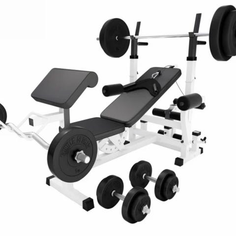 Säädettävä penkkipunnerruspenkki. Mukana levytanko 10kg ja useita levypainoja (yht.70kg)