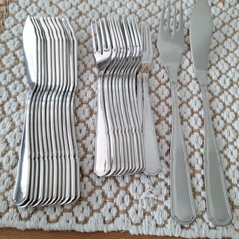 Guy Degrenne kala-aterimet 6 kpl. Kuvissa näkyy laatikossa oleva ruostumattomasta teräksestä valmistettu aterimet, jossa on useita haarukoita sekä erillinen kalaveitsi ja -haarukka. Aterimet soveltuu kattaukseen arkeen ja juhlaan.Ok kunto. Made in France.Nouto tai postitus.Käteinen tai mobilepay.