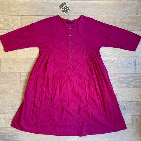 Mittoja: olka-helma 98 cm, kai-kai 50 cm, vyötärönymp. max. 96 cm, säätö/rypytys kiinteällä vyötärönauhalla. Kivat värikkäät yksityiskohdat, pinkki vuori yläosassa, helmaosa vuoriton. Erittäin hyväkuntoinen, h. 45,-