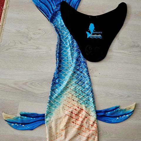 Fin fun Merenneito-pyrstö lapsille. Koko lasten L-Xl, tarkemmat Mitat Kuvissa. Siistikuntoinen, räpylän kärjessä vähän kulumaa, näkyy kuvassa. Nouto Espoo Perkkaa tai postit ostajalle.