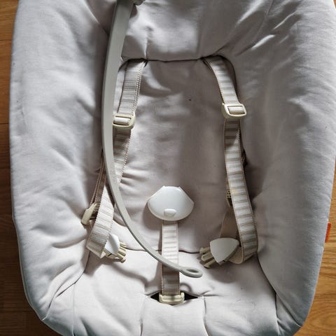 Stokke Nomin newborn set sininen/harmaa. Käännettävä kangas. Valjaissa yhdessä kohtaa tahra johon ei ole yritetty tahran poistoa. Muuten virheetön kunto (oli vain muutaman kk käytössä toisen sitterin ohella). Lelukaaren asento säädettävissä portaattomasti.