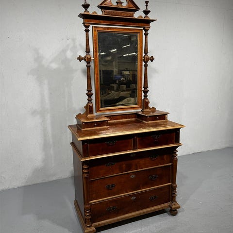 Antiikkinen peilipiironki, jossa on suuri piianpeili ja useita vetolaatikoita. Peilin molemmilla puolilla on pienet kaapit, joissa on koristeelliset lasiovet.