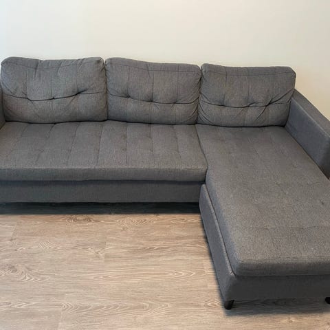 Harmaa kevytrakenteinen sohva divaanilla. Puinen runko mutta kevyt kantaa!