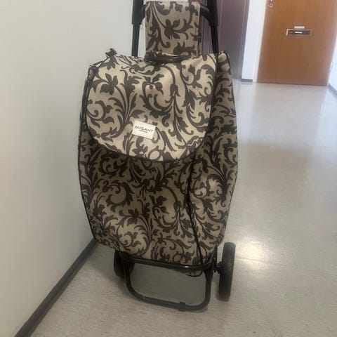 Kuvanmukainen. Laukkuosan Korkeus n. 50cm. Leveys n. 40cm. Laukun takaosassa vetoketju tasku. Isot pyörät. Kahvaa voi säätää.