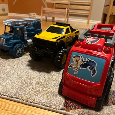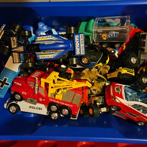 Autoissa kaikissa renkaat tallella, muuten ovat kyllä useat leikit kokeneita. Paristokäyttöiset tarvitsevat uudet paristot. Savuton ja eläimetön koti.