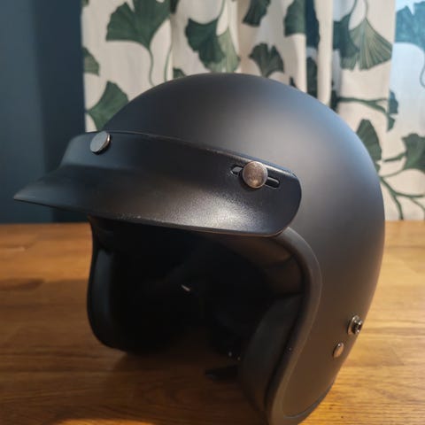 Givi Easy-J avokypärä mustalla kuorella ja vaalealla keskiraidalla. Kypärässä on ruskea ja beige sisäverhoilu sekä leukahihna pikalukolla. Mukana irrotettavat ajolasit, jotka kiinnittyvät kypärän ympäri kulkevaan hihnaan. Sopii moottoripyörä- tai skootterikäyttöön klassisella tyylillä varustettuna avokypäränä. Lasien kuminauha venynyt. Koko L/58.