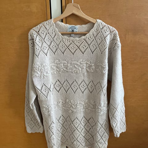 Naisten beige puuvillaneule, koko S. Neuleessa on vaalea kuviollinen pinta ja pyöreä pääntie, jossa on raidalliset reunukset. Materiaalina puuvilla, joka tekee neuleesta pehmeän ja hengittävän. Sopii arkeen ja kerrospukeutumiseen esimerkiksi t-paidan tai topin kanssa.