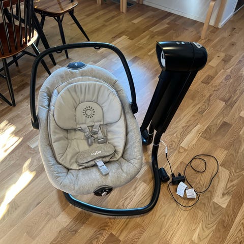 4moms mamaRoo sähköinen sitteri / koliikkikeinu vauvalle. Sitterissä on valkoinen runko ja pehmeä, irrotettava ja konepestävä istuinpehmuste. Laitteessa on ohjauspaneeli, josta voi valita useita eri keinuntaliikkeitä ja säätää liikenopeutta sekä lisätä ääniä kuten white noisea. Sitteri toimii verkkovirralla mukana tulevan virtajohdon avulla. Johdossa muutama pikku nirhauma jotka on varmistettu sähköteipillä, johto on ehyt vauriot on vain pinnassa. Sitterissä on turvavaljaat lapsen kiinnittämistä varten. Kankaat ja pallot on pesty koneessa hajusteettomalla miedolla pesuaineella. Koiratalous. Vain nouto Herttoniemi.