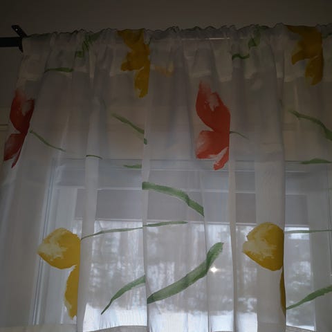 Myydään verhokappa, jossa valkoisella pohjalla on keltaisia kukkia ja vihreitä lehtiä.