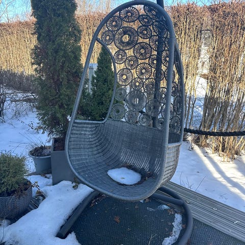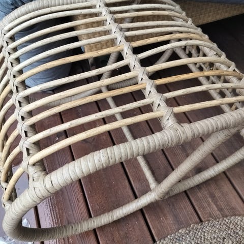 Polyrottinkinen lepotuoli, jossa korkea selkänoja ja käsinojat. Tuolissa on harmaa, koko selkänojan ja istuinosan peittävä pehmuste, joka on kiinnitetty nauhoilla selkänojan taakse. Runko ja punos ovat vaaleanruskeaa polyrottinkia. Sopii esimerkiksi parvekkeelle tai terassille ulkokäyttöön.
