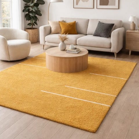 Näyttävä sinapinkeltainen matto, jossa yhdistyy luonnonläheinen tunnelma ja käsityön ainutlaatuinen jälki.