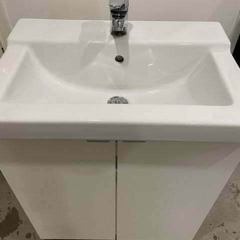 Kylpyhuoneen allaskaappi laatikoilla ja pesualtaalla, Oras hanalla