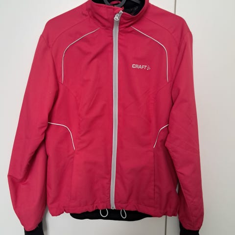 Dæhlie hiihtotakki / urheilutakki naisille, koko S. Takki on pääväriltään punainen. Harmaat osiot ovat trikoomaista hengittävää kangasta. Kaksi vetoketjullista sivutaskua.