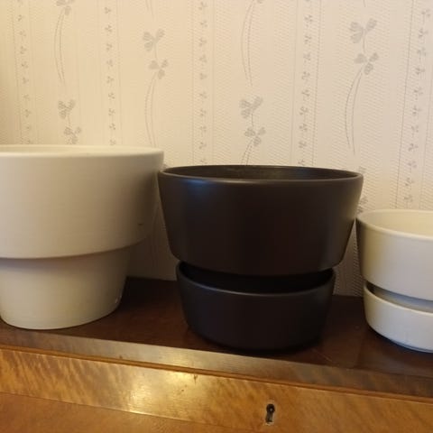 Käytetyt Arabian SN-ruukunaluset 1970-luvulta. Ehjiä ovat, käytöstä tullut kalkkijäämiä sisäpuolelle. Leimat kahdesta kuluneet pois.