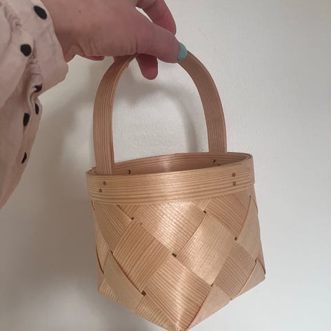 Kiva kierrätysmateriaalista / kahvipusseista punottu kori, korkeus 19,5 cm ja halkaisija 16 cm. Hyvä kunto. Ei kotieläimiä. Nouto tai postitus.