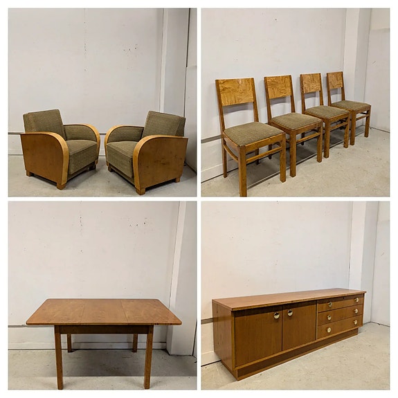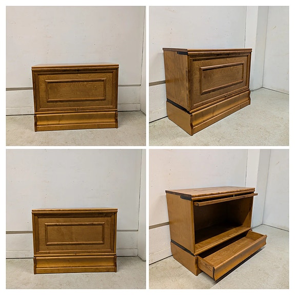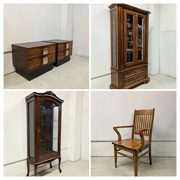 Komea 30/40-luvun liukulasivitriini myytävänä. Koostuu 5 eri osasta, jotka pinottavia päällekkäin. Kaikki liukulasit ehjiä ja niissä on uurrettu vedin. Ajan tuomaa patinaa ja jälkeä löytyy paikka paikoin. Yleisilme ikäisekseen siisti. Vanhaa madon reikää alaosassa. Ei hajuja.