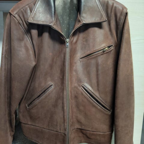 Big L miesten lampaannahkatakki, koko 52. Väri ruskea. Materiaalina nahka, sisäpuolella tikattu vuori. Edessä nappikiinnitys ja useita taskuja. Selkäpuoli sileä ilman koristeita. Soveltuu miesten ulkotakiksi.