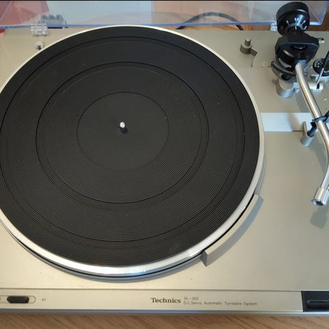 Levysoitin, kasettisoitin ja vahvistin. Kuulokkeet ja laatikon LP-levyjä saa mukaan.