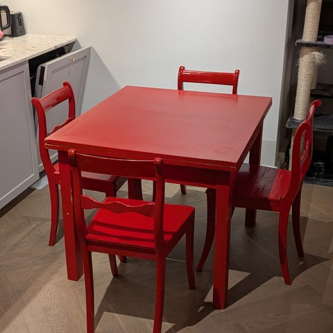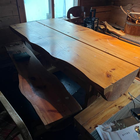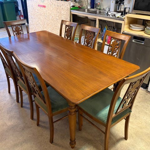 Vanha suomivalmisteinen täysin huollettu massiivinen pöytä ja 8 tuolia. Terassille tai sisälle. Pöytä ja tuolit kaikki ehjiä, alkuperäisillä puutappiliitoksilla. Ei pilattu siis liimalla tai ruuveilla. Pari tuolia nitisee vähän, mutta muuten paremmassa kunnossa olevaa et löydä. Tarvittaessa myyn vain 4 tuolilla jotka voit itse valita.