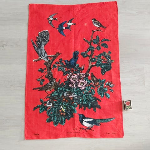 Hyvin kaunis vanha kuultokudos. Ripustustanko kadoksissa. Yleisilme hyvä vintage tekstiili, yhdessä kohtaa joutuu vähän näpräilemään, jos häiritsee ja levittämään langat, kts. kuva.