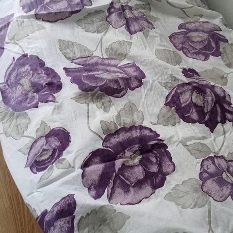 Kukkakuosillinen verho . Verhossa on vaalealle pohjalle painettu kukkakuviointi vaalea lila Sopii käytettäväksi esimerkiksi olohuoneen tai makuuhuoneen ikkunaverhona.