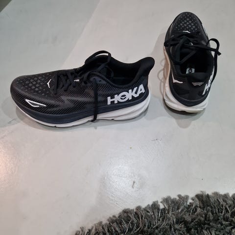 Hoka Clifton 9 juoksukengät, koko 39 1/3. Väri valkoinen. Päällinen hengittävää tekstiilimateriaalia, nauhakiinnitys. Paksu vaimennettu välipohja ja kumipohja juoksuun ja kävelyyn. Sopii juoksukäyttöön ja yleiseen liikuntaan. Kengät ovat hyvässä kunnossa ja käytetty aika vähän, koska lesti ei oikein sovi käyttäjälle.