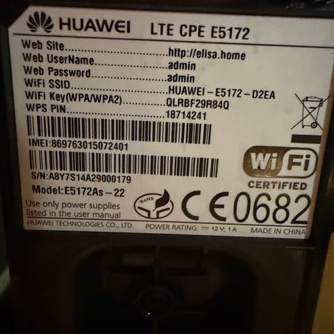 Huawei 4G Router 3 Pro reititin valkoinen. 4G LTE -reititin, jossa tuki 2,4 GHz ja 5 GHz WiFi -verkoille. Laitteessa useita Ethernet-portteja langallista verkkoa varten sekä paikka virtalähteelle. Mukana virtalähde, verkkokaapeli ja käyttöohjeet kuvien mukaisesti. Soveltuu kotiverkon tai pienen toimiston internet-yhteyden jakamiseen mobiiliverkon kautta. Itse käytin mökkireissuilla Saimaalla ja toimi oikein hyvin. Nyt kotona tarpeettomana. Hinta oli uutena muistaakseni noin 120 € Telialta ostettuna. Mielellään nouto ja käteisellä, mutta postitus onnistuu myös ostajan piikkiin.