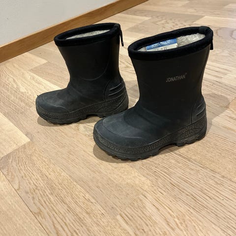 Jonathan lasten kumisaappaat, koko 21. Väri musta, unisex-malli. Saappaissa on karkea pohjakuvio, joka antaa pitoa liukkaalla alustalla. Varressa on hieman korkeampi malli, joka suojaa jalkaa roiskeilta. Sisäpuoli on vuorattu vaalealla vuorimateriaalilla mukavuuden lisäämiseksi. Soveltuvat sekä tytöille että pojille arki- ja ulkoleikkeihin kosteissa olosuhteissa.