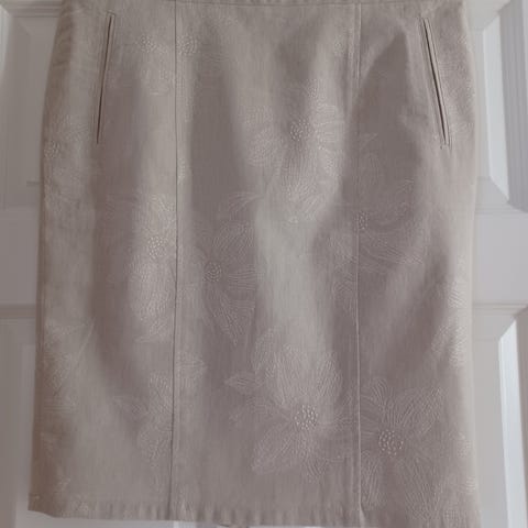 Voglia pellavahame, naisten koko 44. Valkoinen, polvipituinen hame, jossa suora malli. Valmistettu pellavasta, vuorillinen sisäpuolelta. Takana vetoketju ja halkio, edessä koristenapit helmassa. Sopii arkikäyttöön ja siistimpään pukeutumiseen. Ei toridiiliä, voidaan postittaa.
