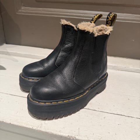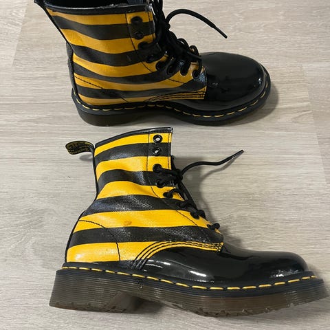 ”Dr. Martens saappaat, koko 36. Nauhalliset, nilkan yli ulottuvat saappaat. Väri musta, kiiltävä pinta. Paksu, kuvioitu kumipohja. Sopivat arkikäyttöön ja vaihteleviin sääolosuhteisiin”