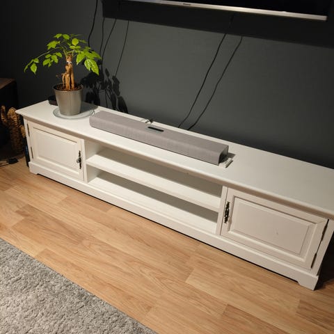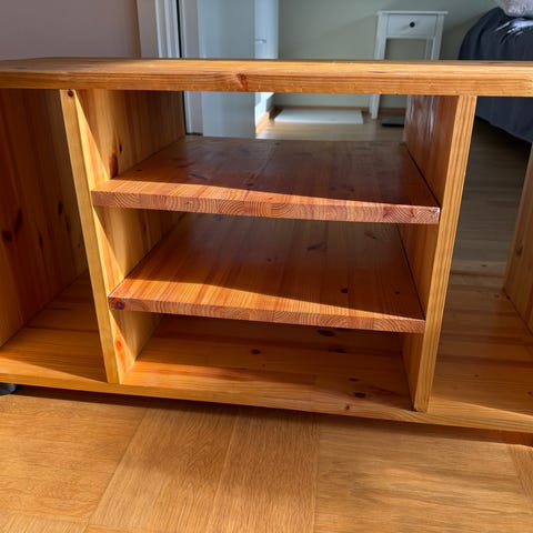 Akaasiapuinen sävähdyttävä TV-taso isommallekin ruudulle. 180 x 55 cm. Korkeus 45 cm. Välissa avohyllyt, molemmissa päissä kaapit.
