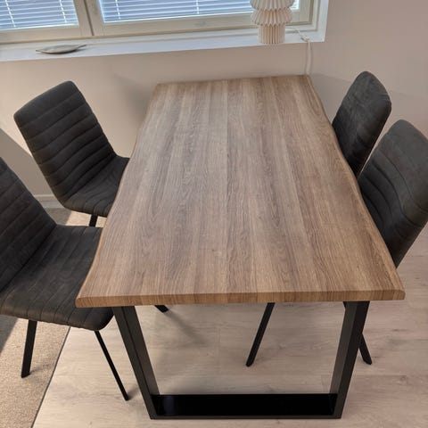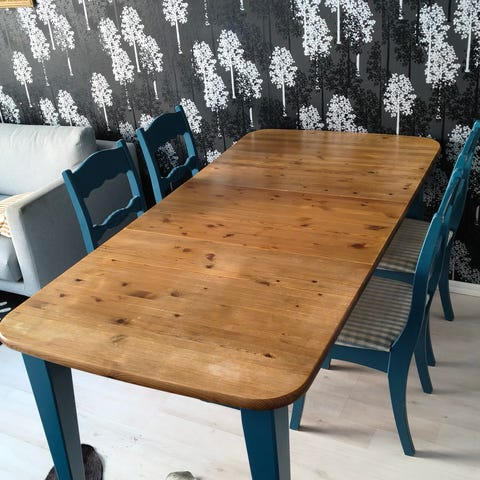 Elämää nähnyt ruokailuryhmä. Pöytä suht tukeva, pinnassa painaumajälkiä ja kulumaa. Tuoleissa kulumaa ja käytetty kulmarautoja tuen lisäämiseksi. Kaksi tuolia tukevia ja kaksi hieman heiluvia, vaatisi pientä laittoa. Yhdessä tuolissa pieni reikä kankaassa tuolin sivulla. Fiksauksella vielä oikein oiva peli 👍🏻