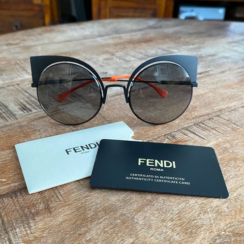 Fendi aurinkolasit naisille. Pyöreät linssit, joissa ruskea sävy ja Fendi-logo linssien pinnassa. Ohut metallinen kehys ja nenäsilta kullanvärisenä. Sangan rakenne on metallia, ja nenätyynyt ovat läpinäkyvää muovia. Mukana Fendi-säilytyskotelo ja puhdistusliina kuvien mukaisesti.